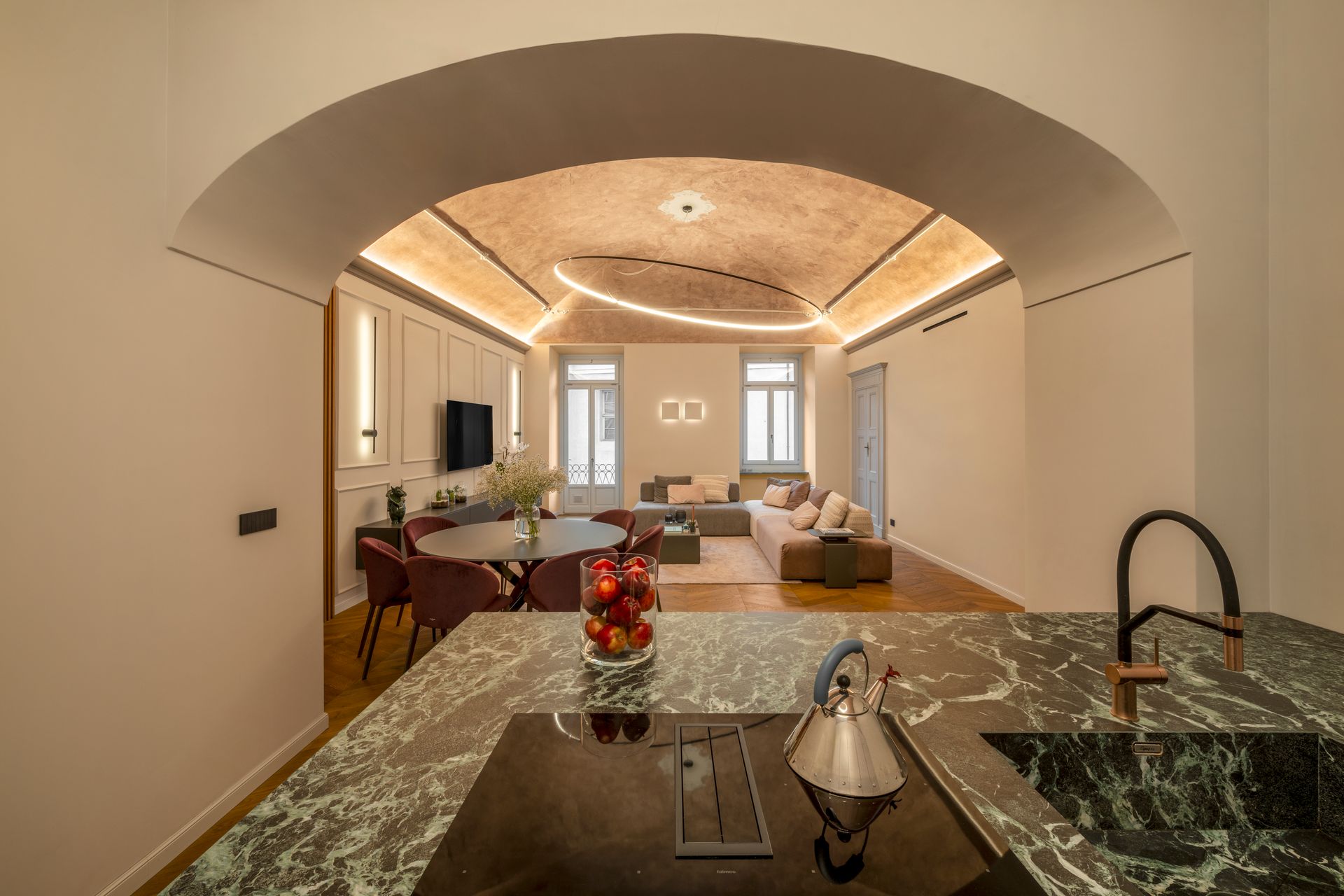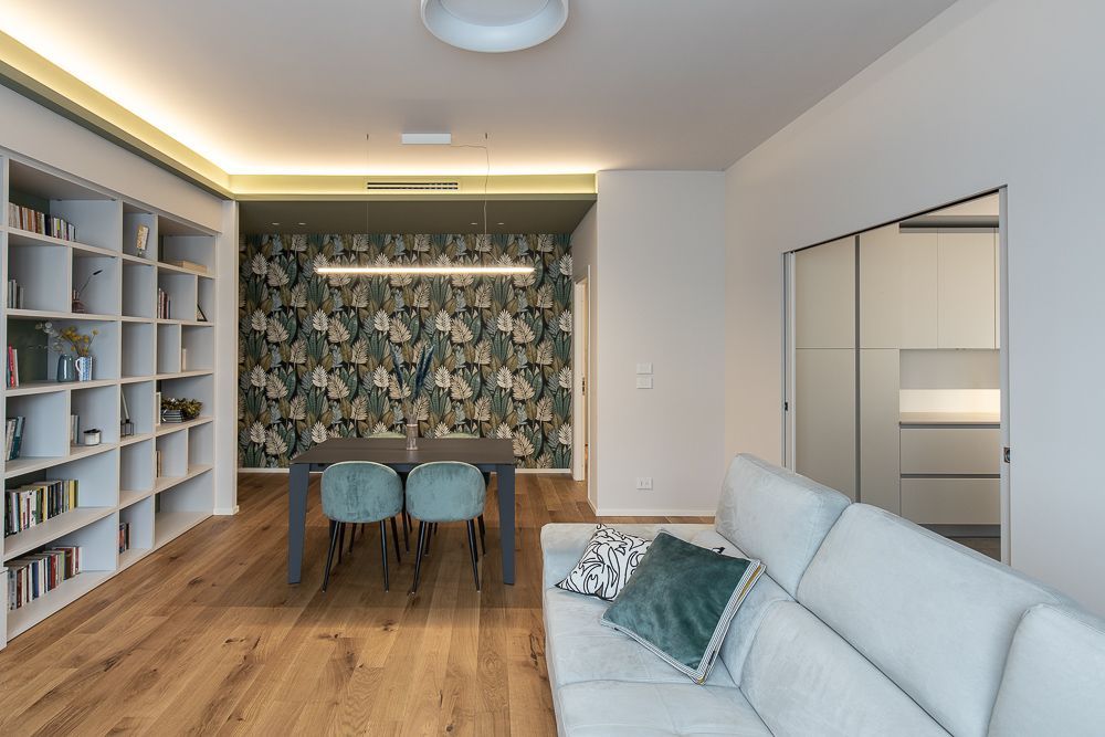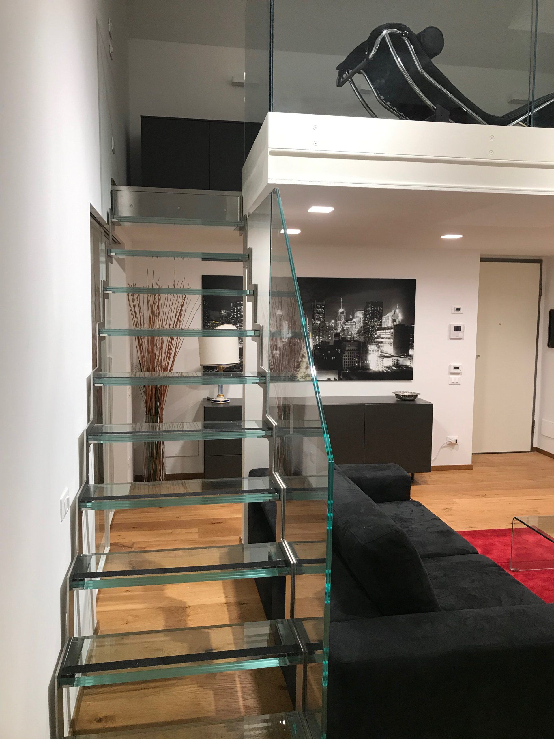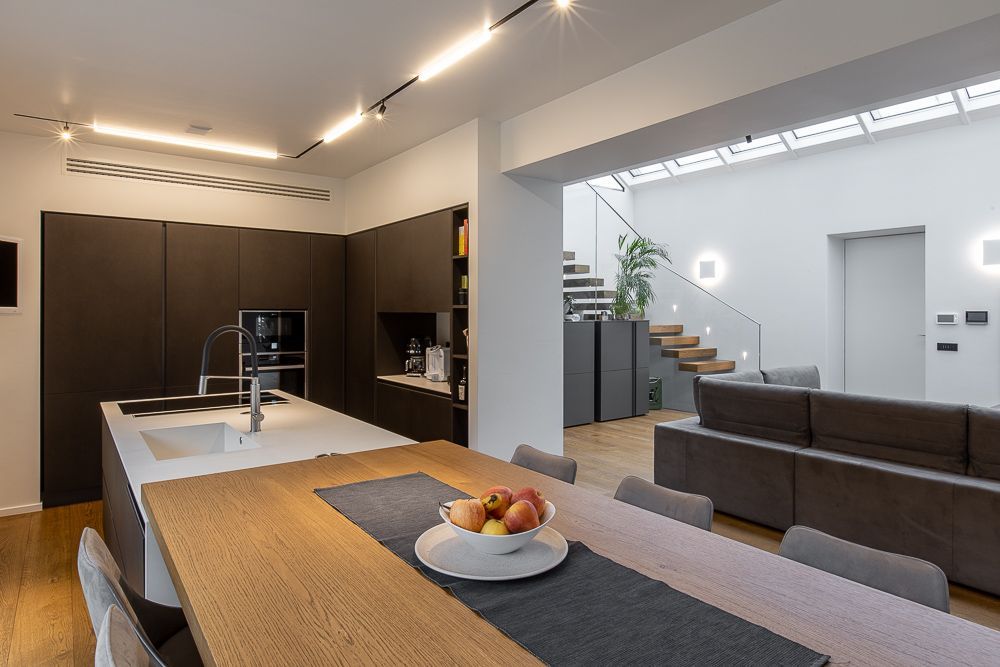 In questo intervento di restyling completo è stata data una nuova vita alla zona giorno intervenendo sull'arredo, sull'illuminazione ma sopratutto su due elementi architettonici molto impattanti: l'arco che divide la cucina dalla zona giorno e la scala.