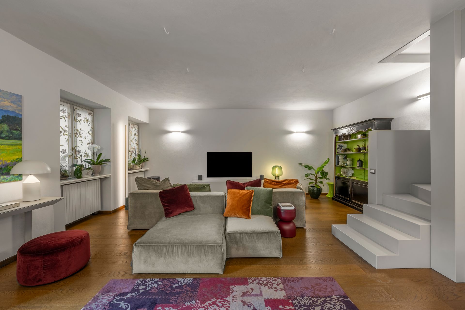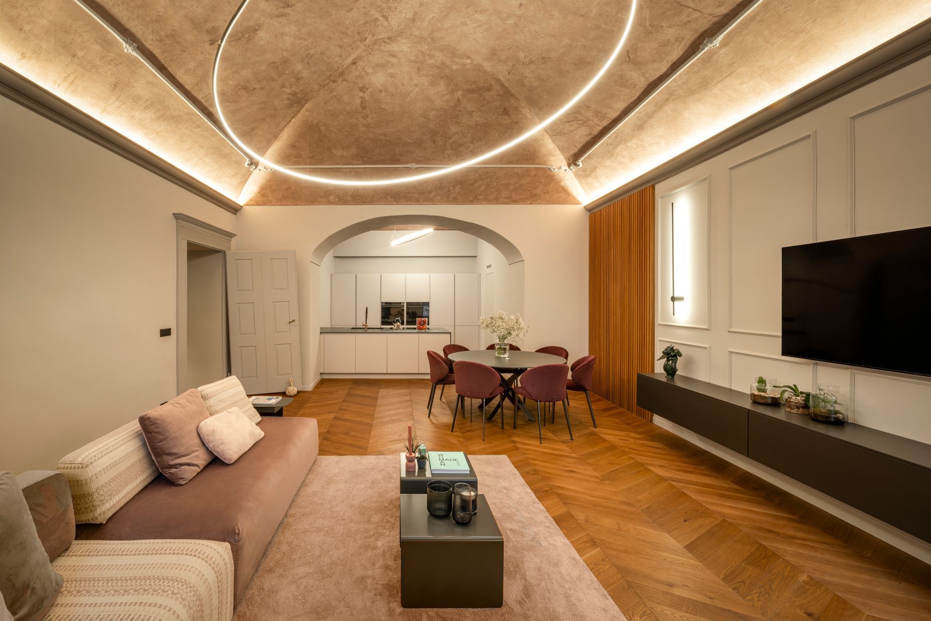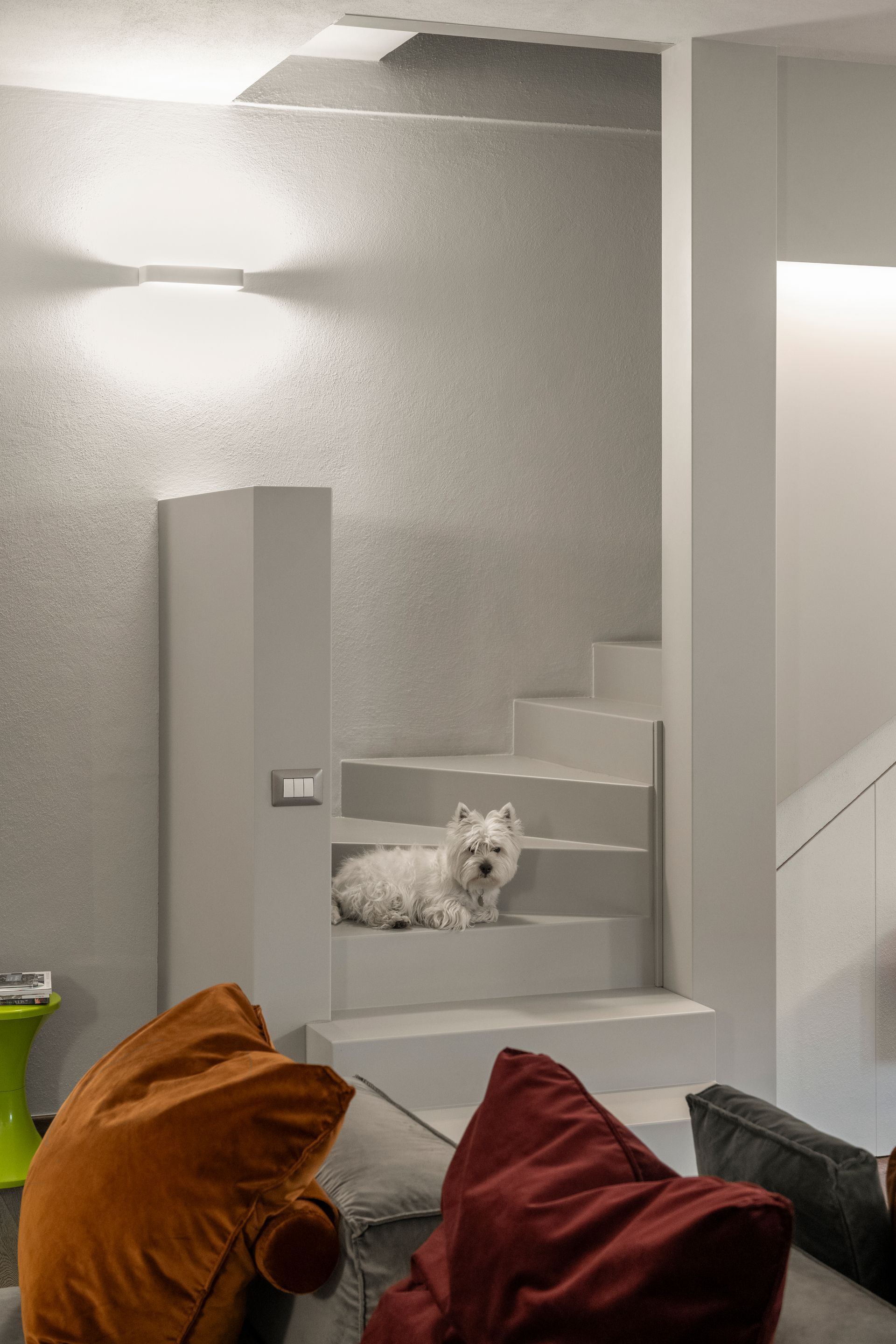 In questo intervento di restyling completo è stata data una nuova vita alla zona giorno intervenendo sull'arredo, sull'illuminazione ma sopratutto su due elementi architettonici molto impattanti: l'arco che divide la cucina dalla zona giorno e la scala.