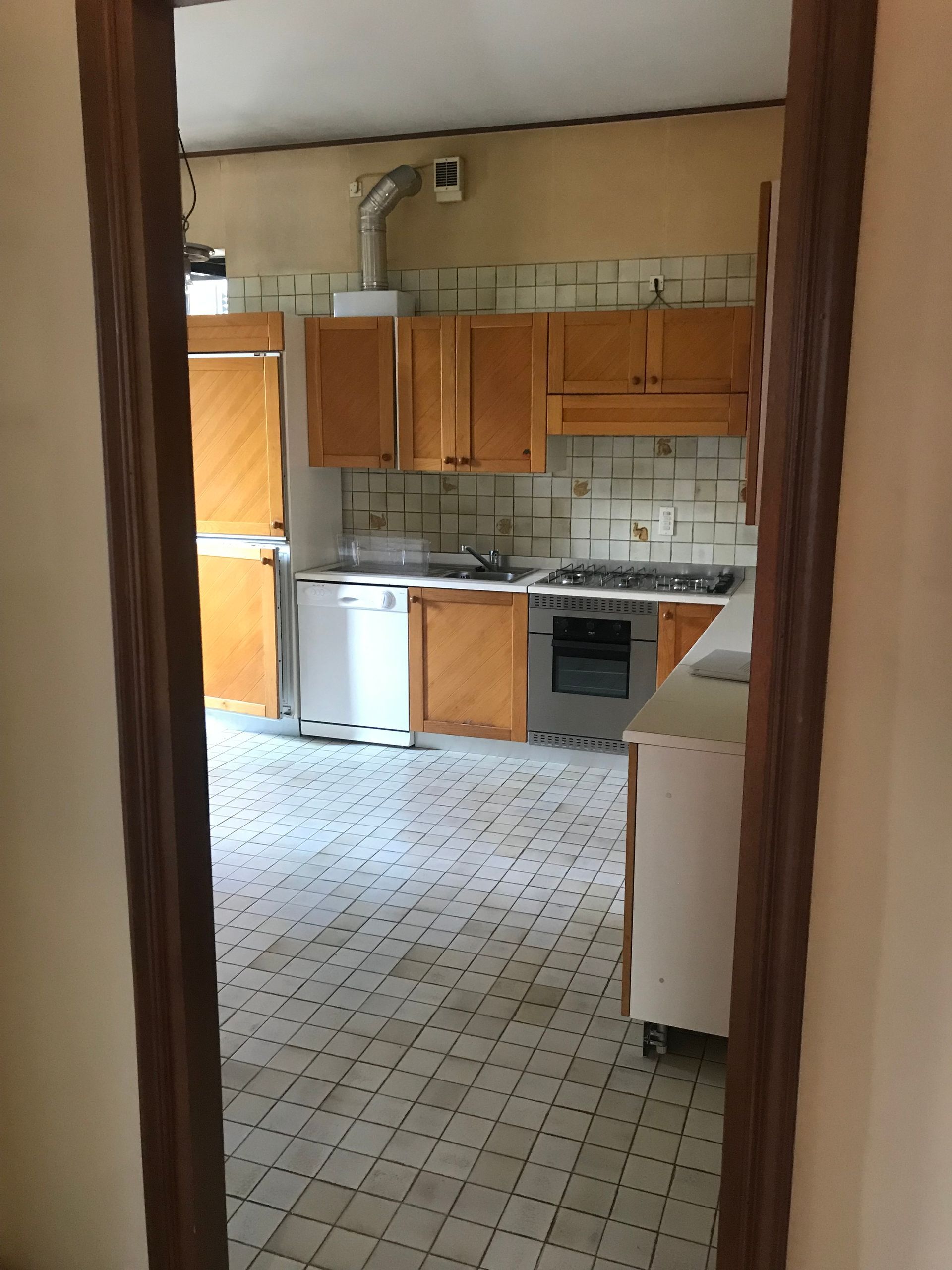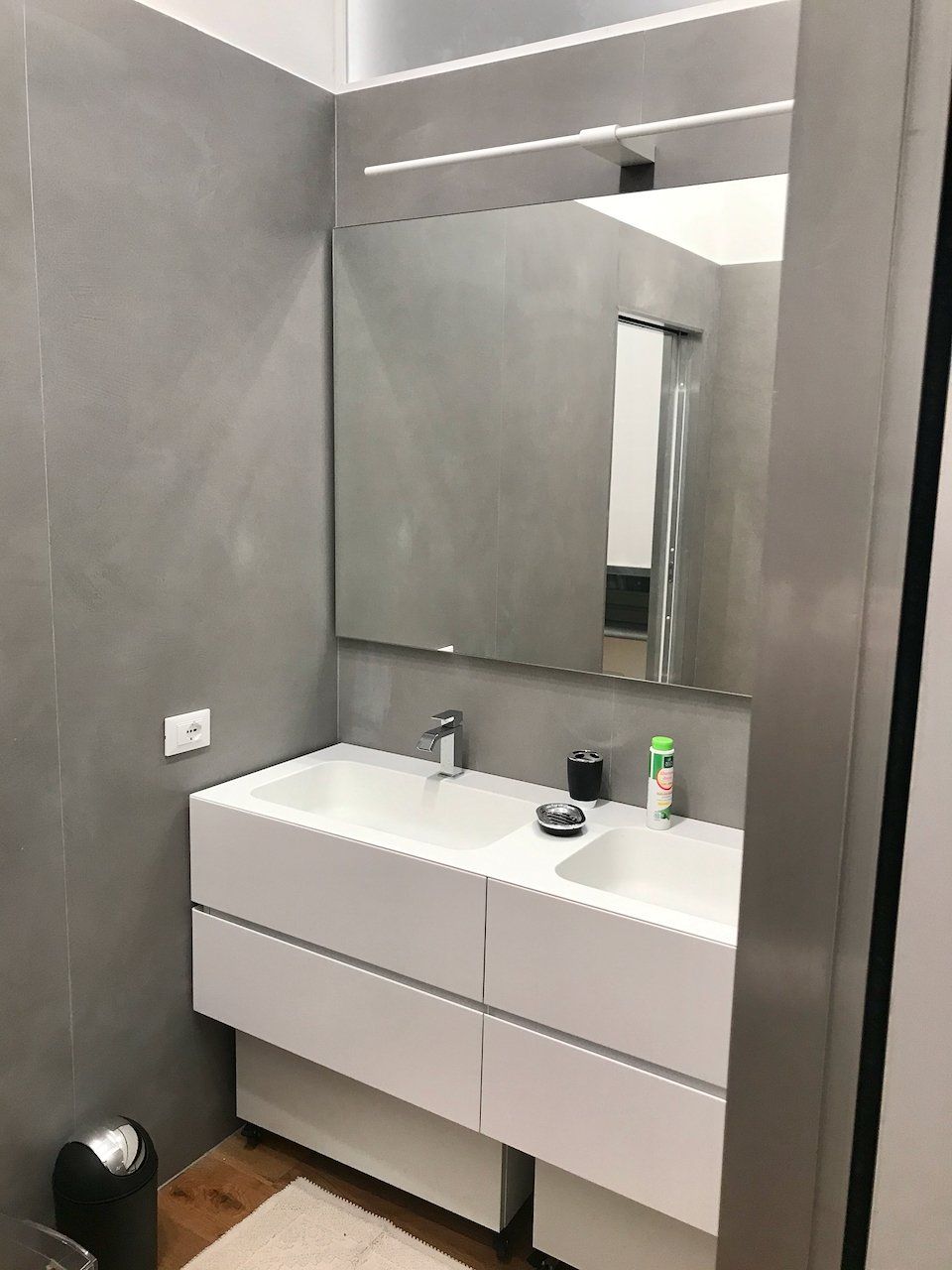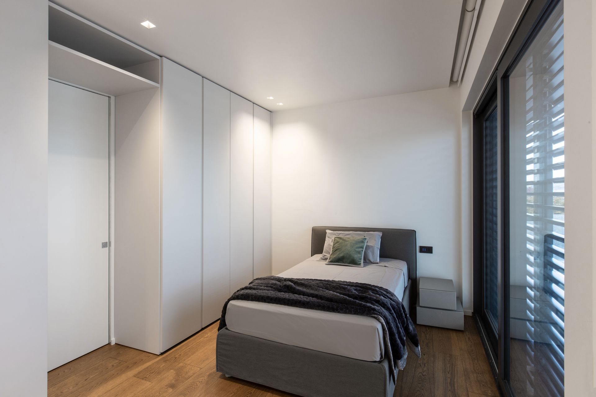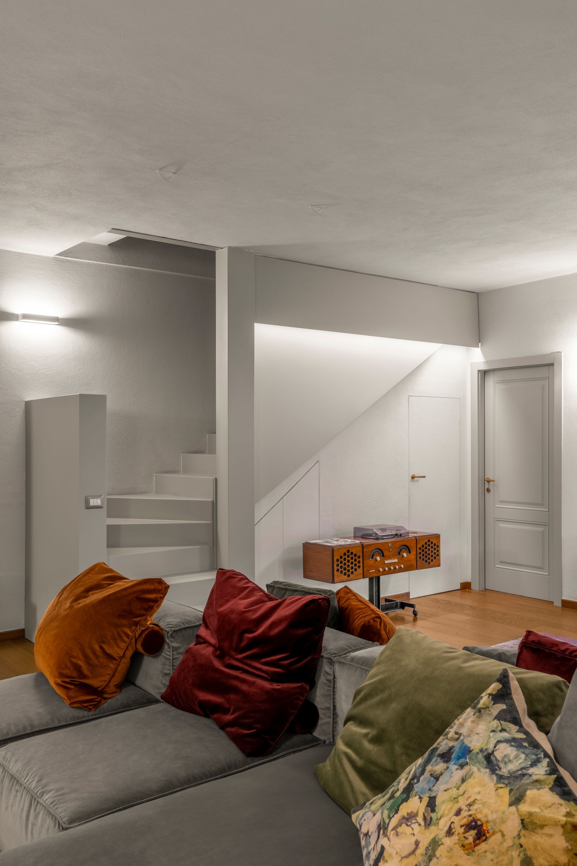Il layout degli spazi interni è stato modificato per permettere una comunicazione fra la zona soggiorno e la cucina. I due ambienti dovevano essere continui ma allo stesso tempo la cucina doveva essere chiusa a seconda dell’utilizzo. Per lasciare massima libertà al design e dare alla parete che separa la zona cucina dal soggiorno, una continuità cromatica, è stato deciso di utilizzare una doppia porta filomuro che ha la particolarità di non avere né stipiti né cornici coprifilo. In questo modo è stato possibile conferire un design minimale alla parete e lo spazio risulta libero da elementi di disturbo, sia fisici che visivi. La richiesta era quella di avere i due ambienti uniti ma poterli chiudere