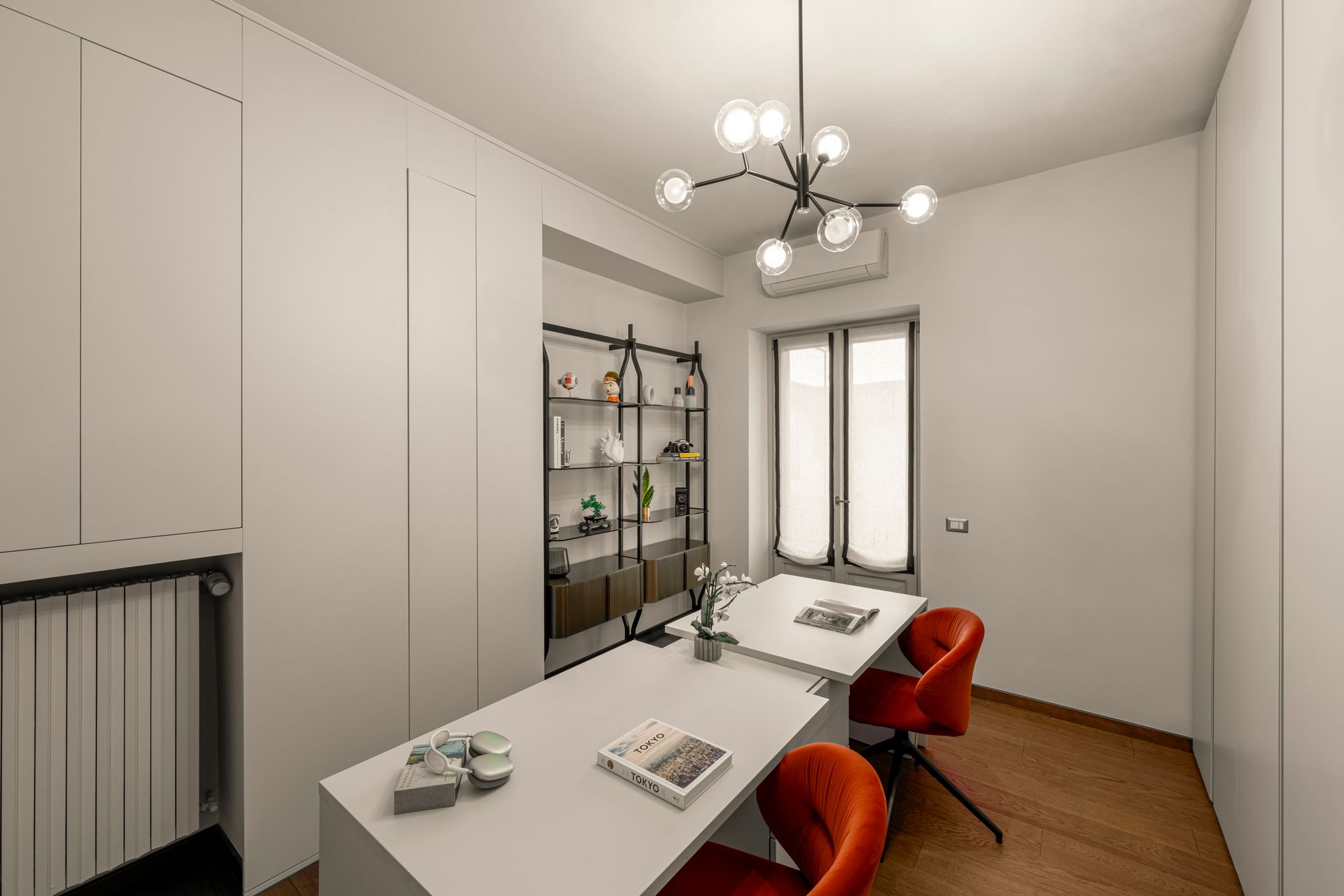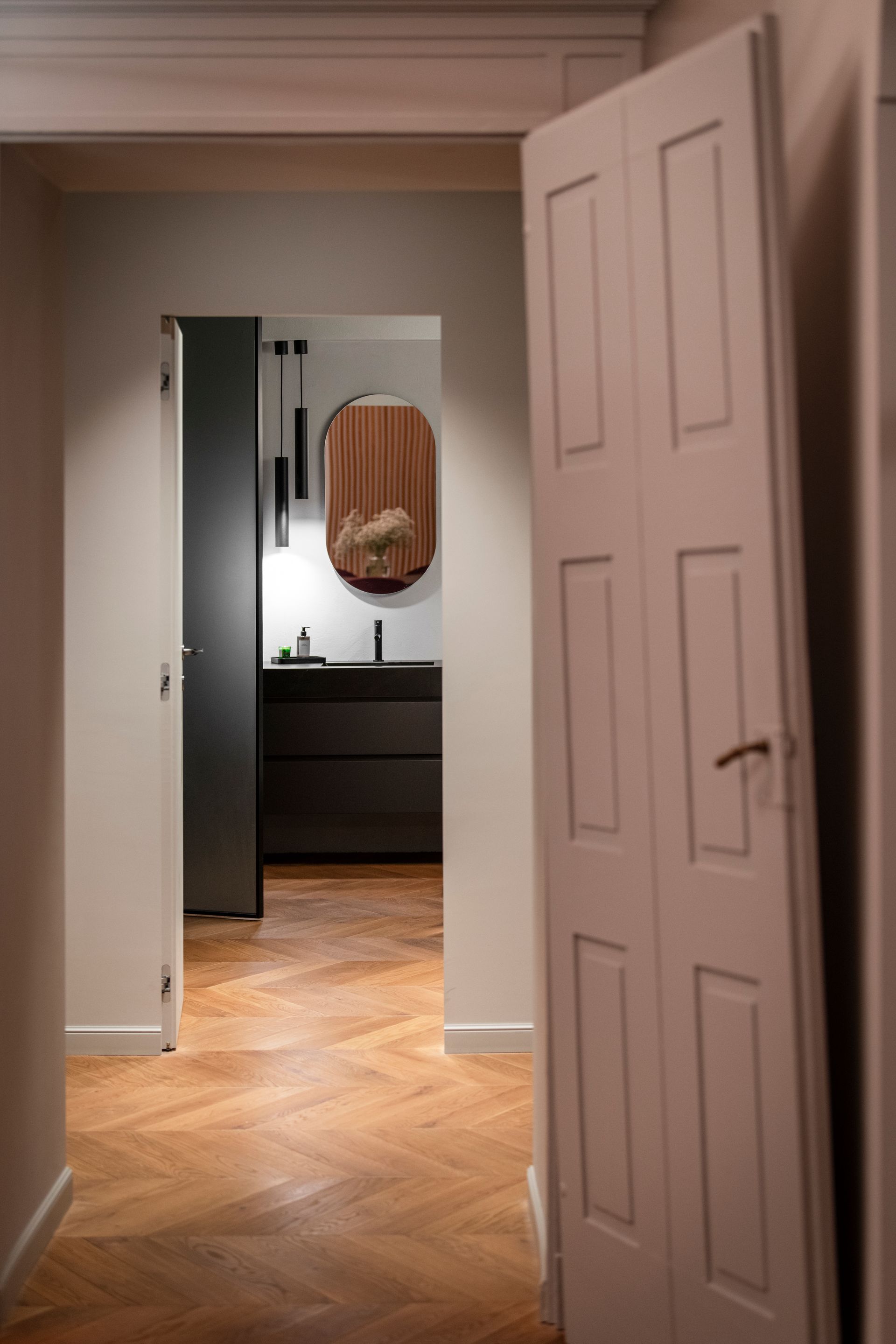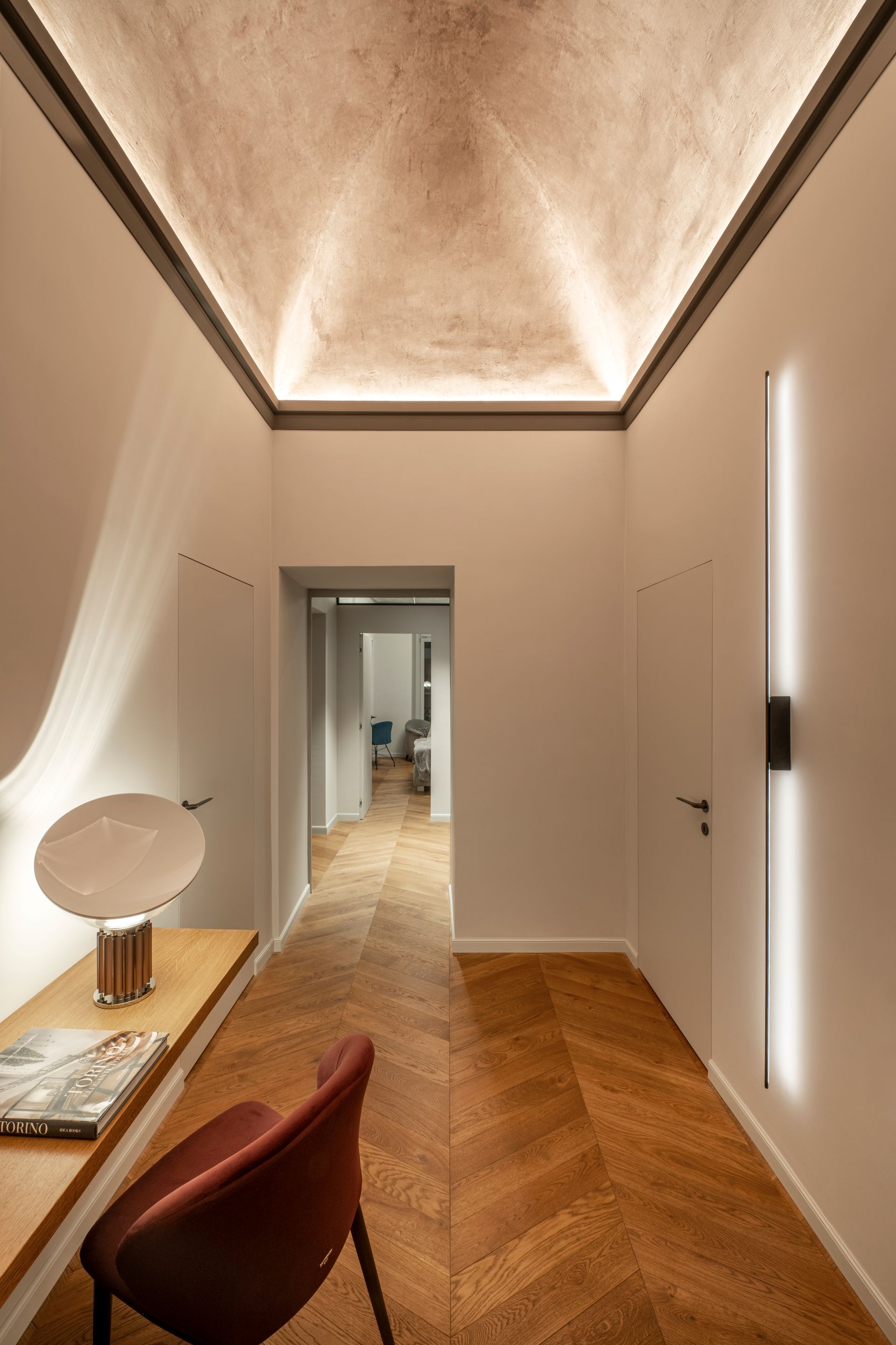La scelta del pavimento è ricaduta su un parquet di rovere oliato a correre, che enfatizza la camminata tra i vari ambienti dell’alloggio. Il colore del battiscopa riprende quello delle porte, alcune delle quali realizzate ex novo su disegno, riprendendo quelle originali esistenti, utilizzando un unico RAL per creare una morbida continuità tra gli ambienti.