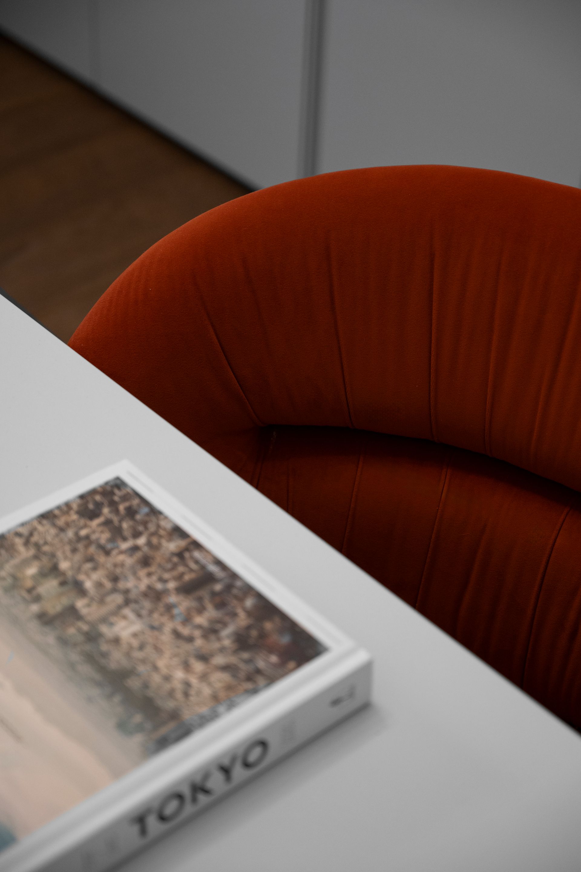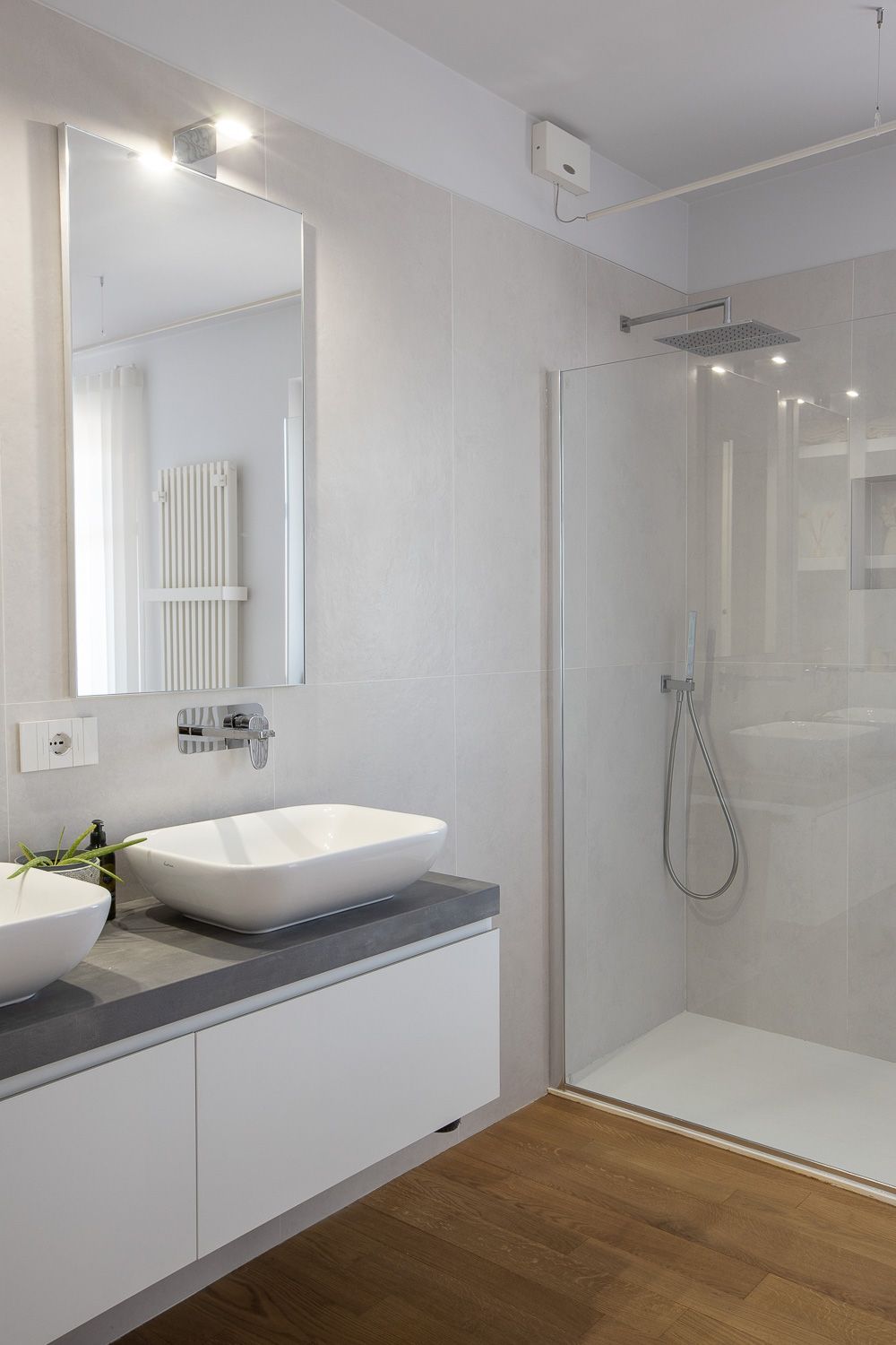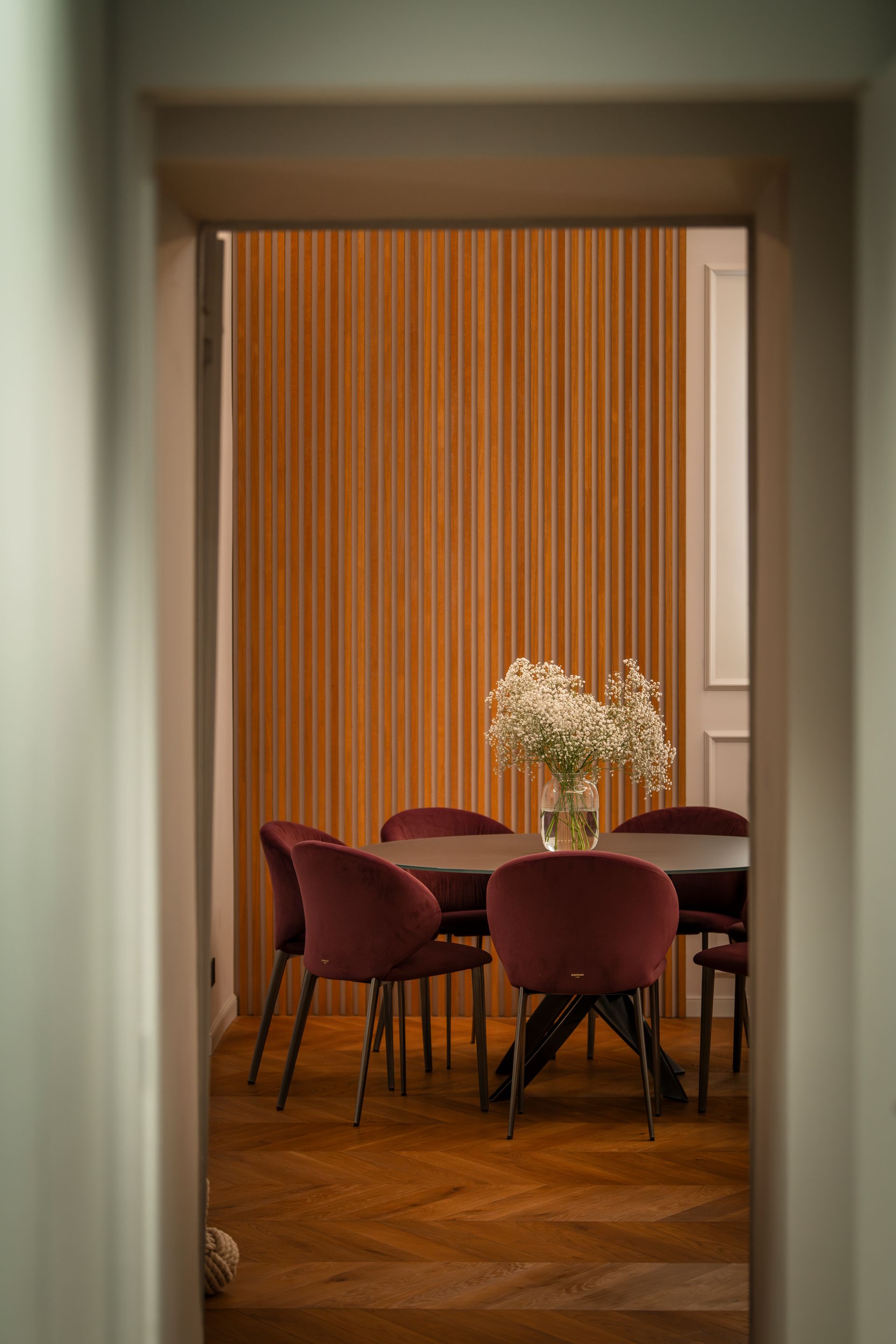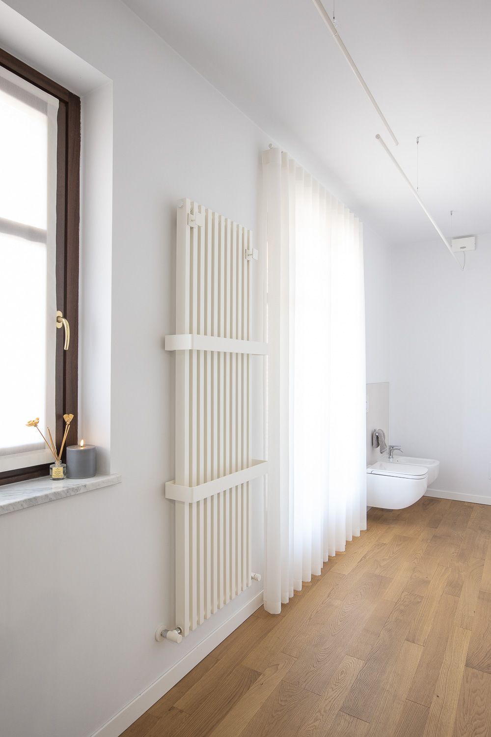 La scelta del pavimento è ricaduta su un parquet di rovere oliato a correre, che enfatizza la camminata tra i vari ambienti dell’alloggio. Il colore del battiscopa riprende quello delle porte, alcune delle quali realizzate ex novo su disegno, riprendendo quelle originali esistenti, utilizzando un unico RAL per creare una morbida continuità tra gli ambienti.