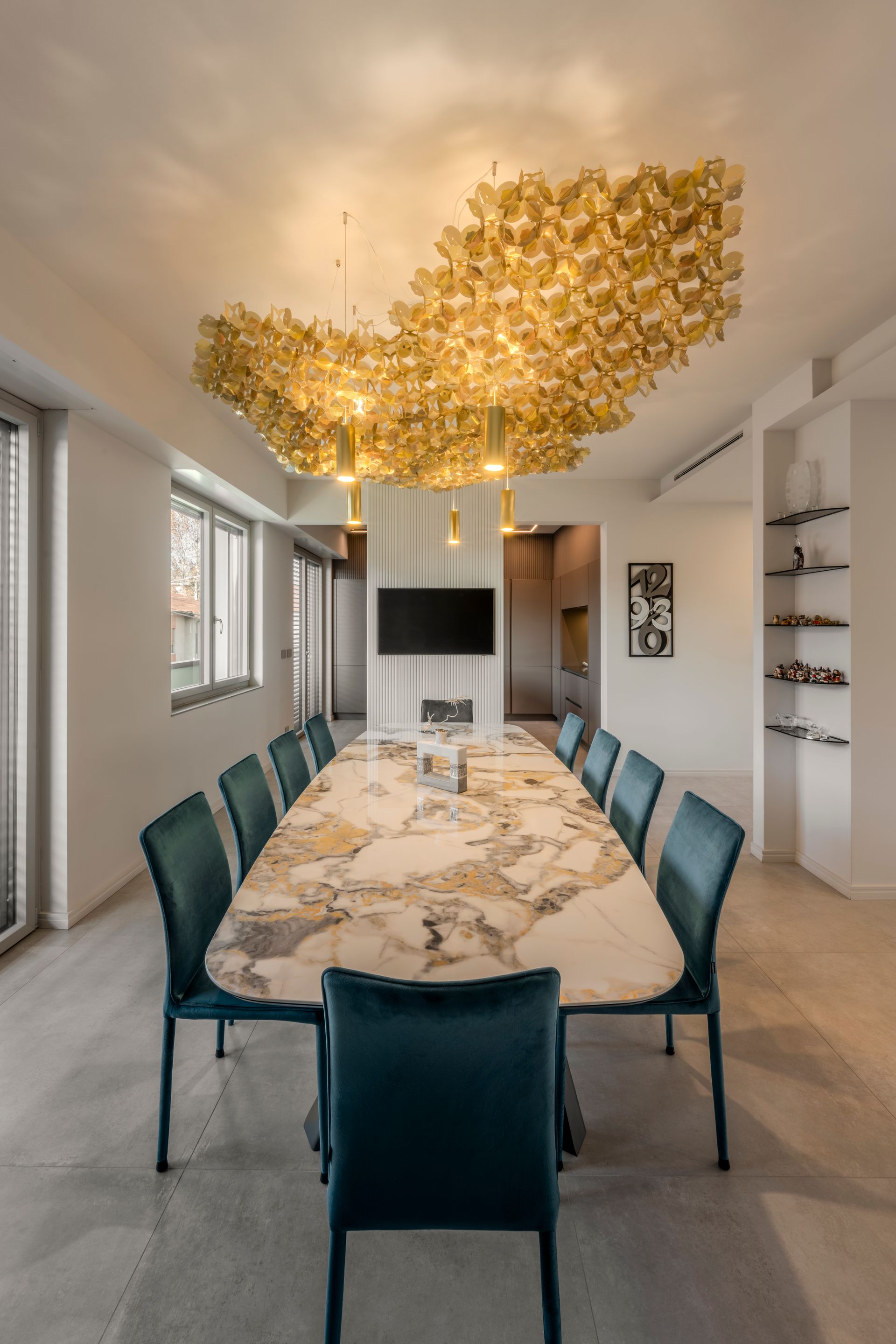 La parete bifacciale, realizzata su disegno, fa si che la cucina a vista conviva, nello stesso spazio, con un salone dalle dimensioni decisamente generose che ospita la zona relax e la zona pranzo. Al piano terra si trova anche la camera padronale, collegata alla cabina armadio e al bagno padronale.