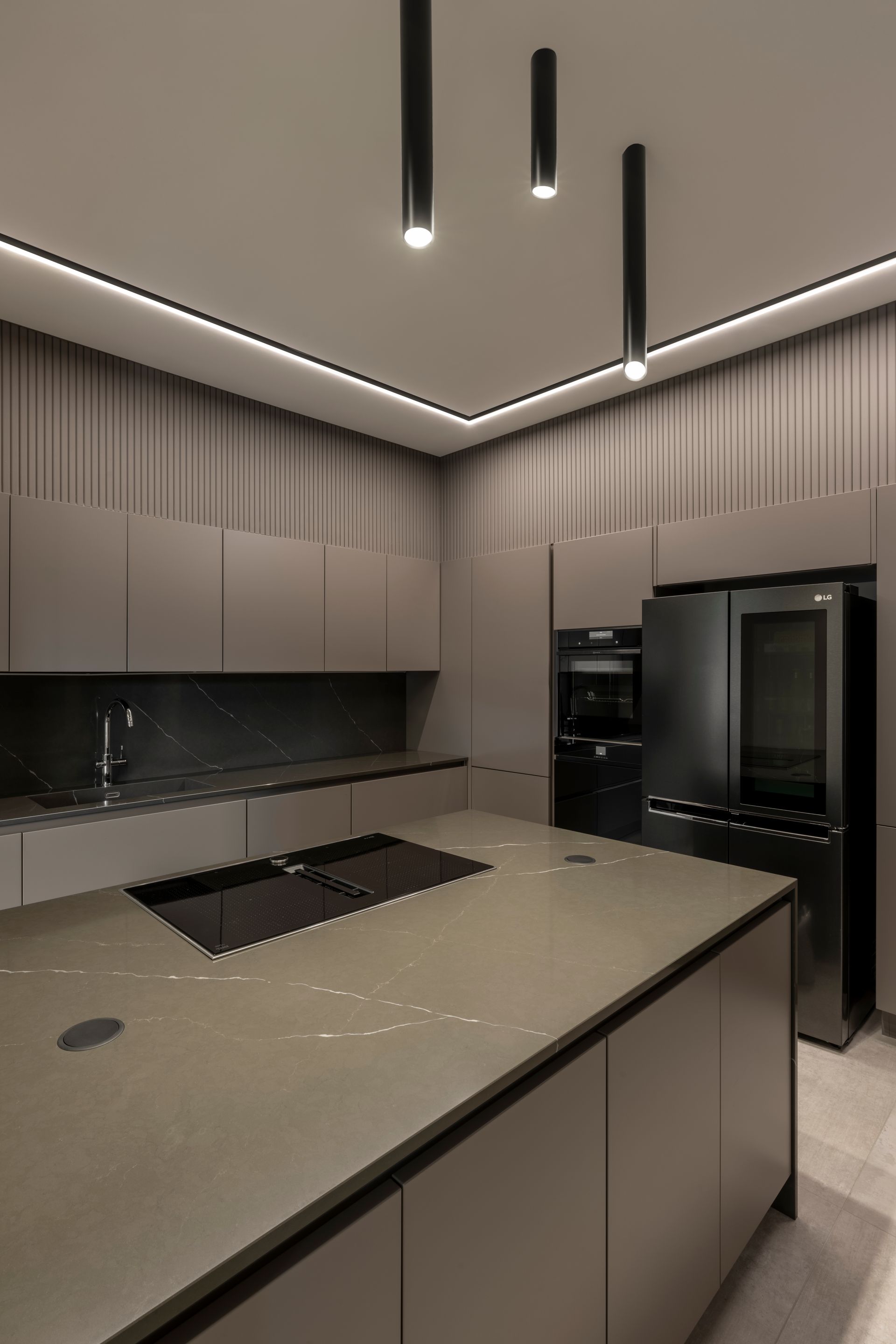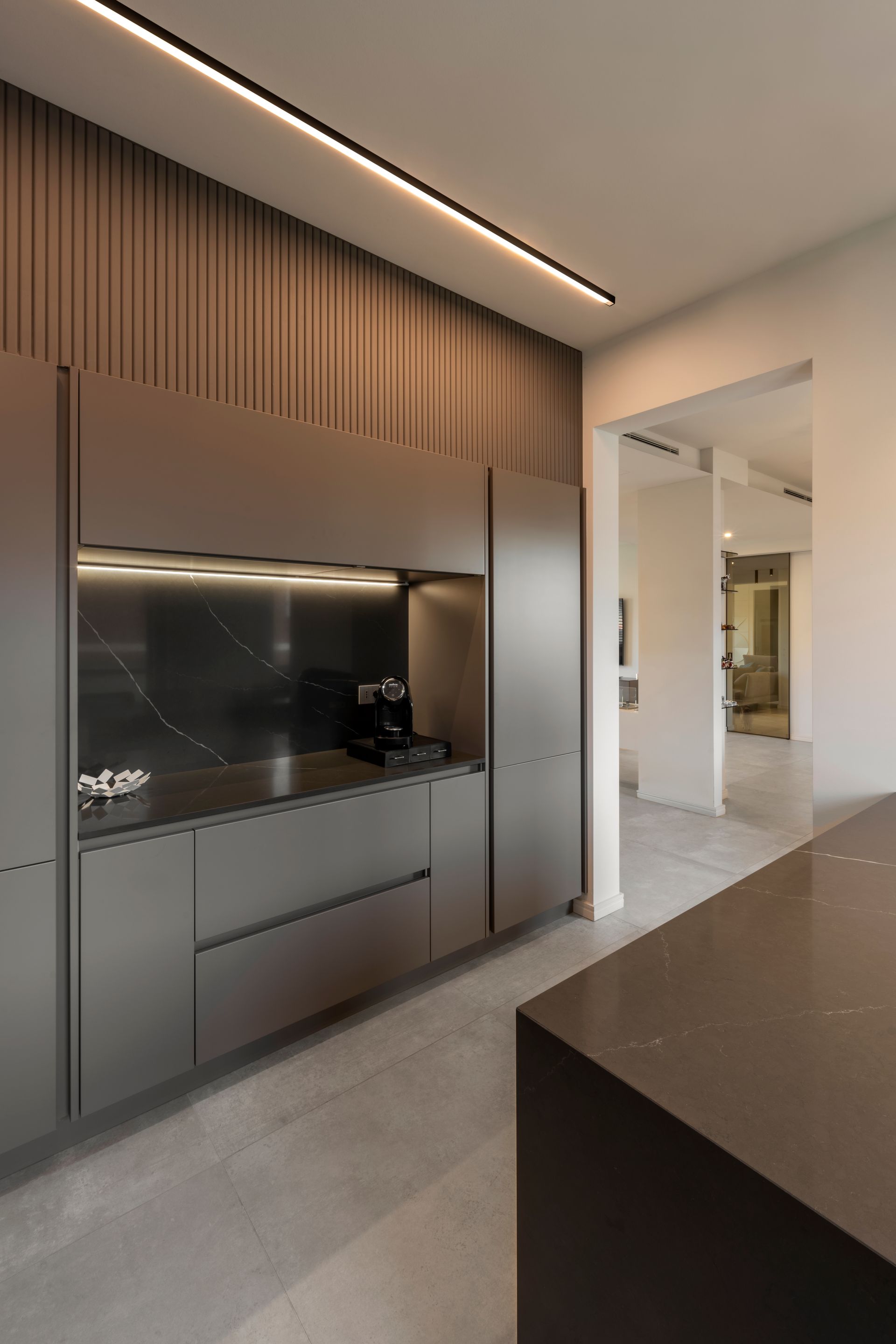 Le immagini degli interni si riferiscono all’appartamento più grande, che occupa i due livelli centrali per un totale di 180 m2 e la cui distribuzione è stata completamente ripensata a seguito della demolizione di tutte le vecchie partizioni interne. Il primo piano è adibito a living e i proprietari volevano che fosse un ambiente il più possibile aperto: il progetto ha preso il via dagli unici due pilastri, piuttosto ravvicinati, che non era possibile nascondere, e tra di essi è stato inserito un camino bifacciale a bioetanolo che fa da spartiacque tra la zona dedicata al relax e il tavolo da pranzo. Più in profondità, sempre su specifica richiesta, sono state progettate due cucine identiche nelle finiture, ma con funzioni diverse, una operativa e l’altra di accoglienza, tra le quali c’è un bagno per gli ospiti. Al piano superiore, dove si trovano gli spazi privati, si sale sia tramite scala interna sia con l’ascensore: la parte a sinistra del corridoio è una suite padronale con cabina armadio e bagno privato con sauna, a destra ci sono uno studio e una camera secondaria, cui è abbinato un bagno completo in fondo al corridoio.