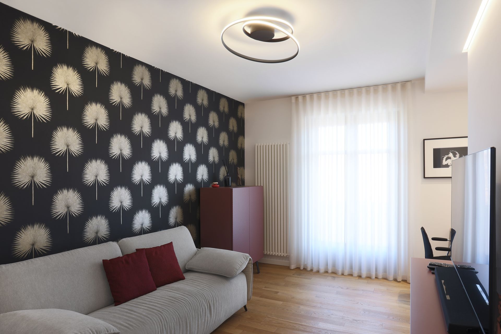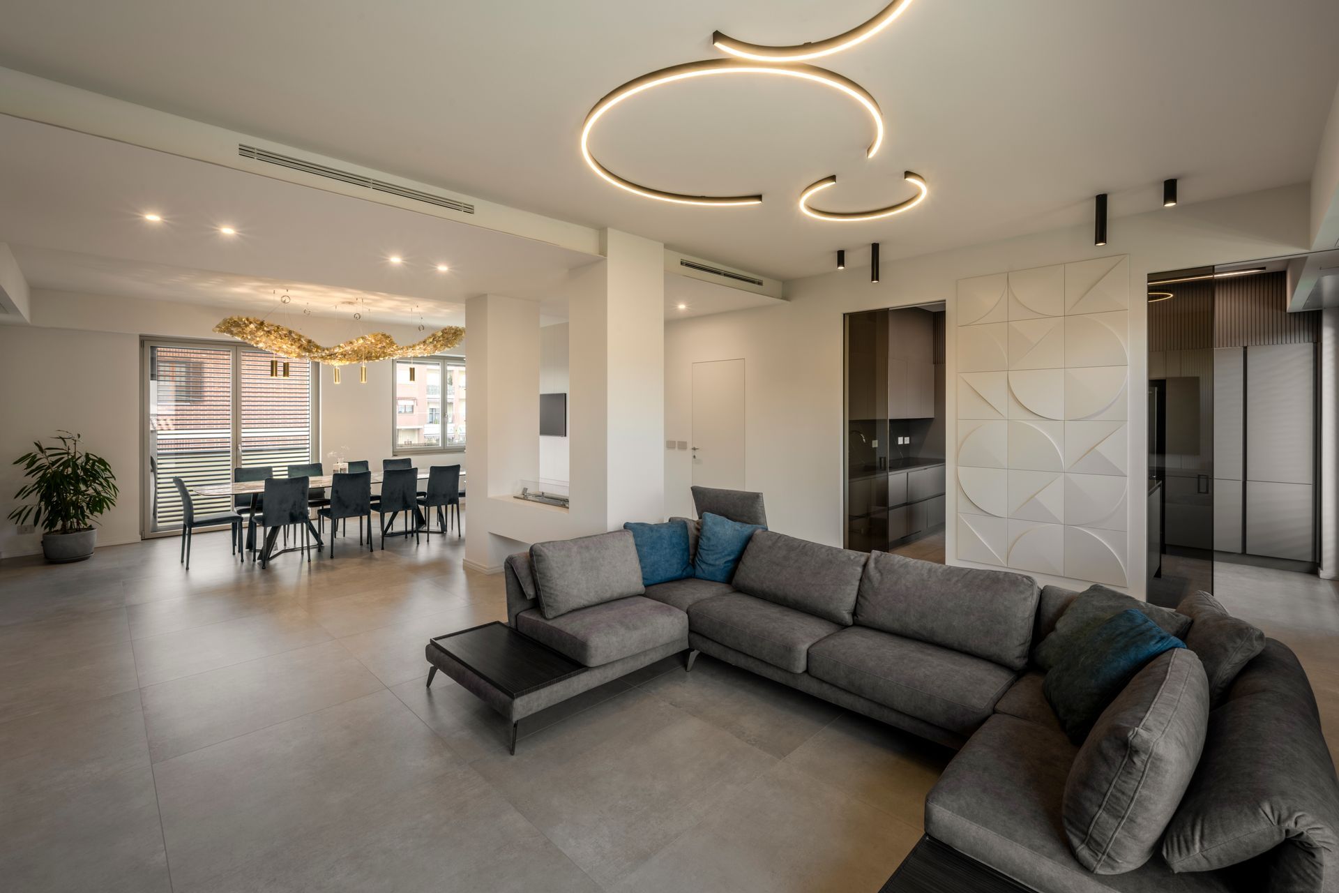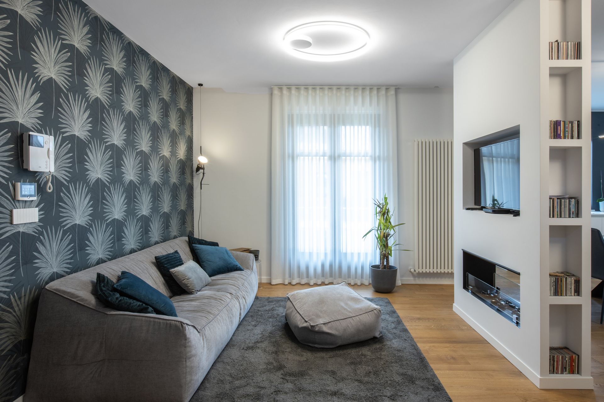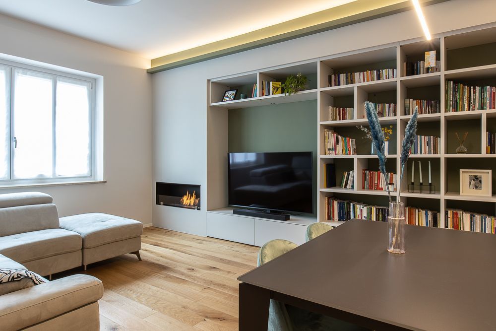 Il soggiorno é stato parzialmente modificato attraverso l’inserimento di una parete bifacciale con biocamino integrato. Lo spazio rimane open ma attraverso questo elemento divisorio si sono suddivisi scenograficamente gli spazi.