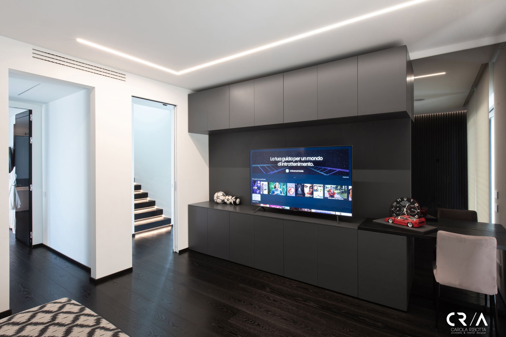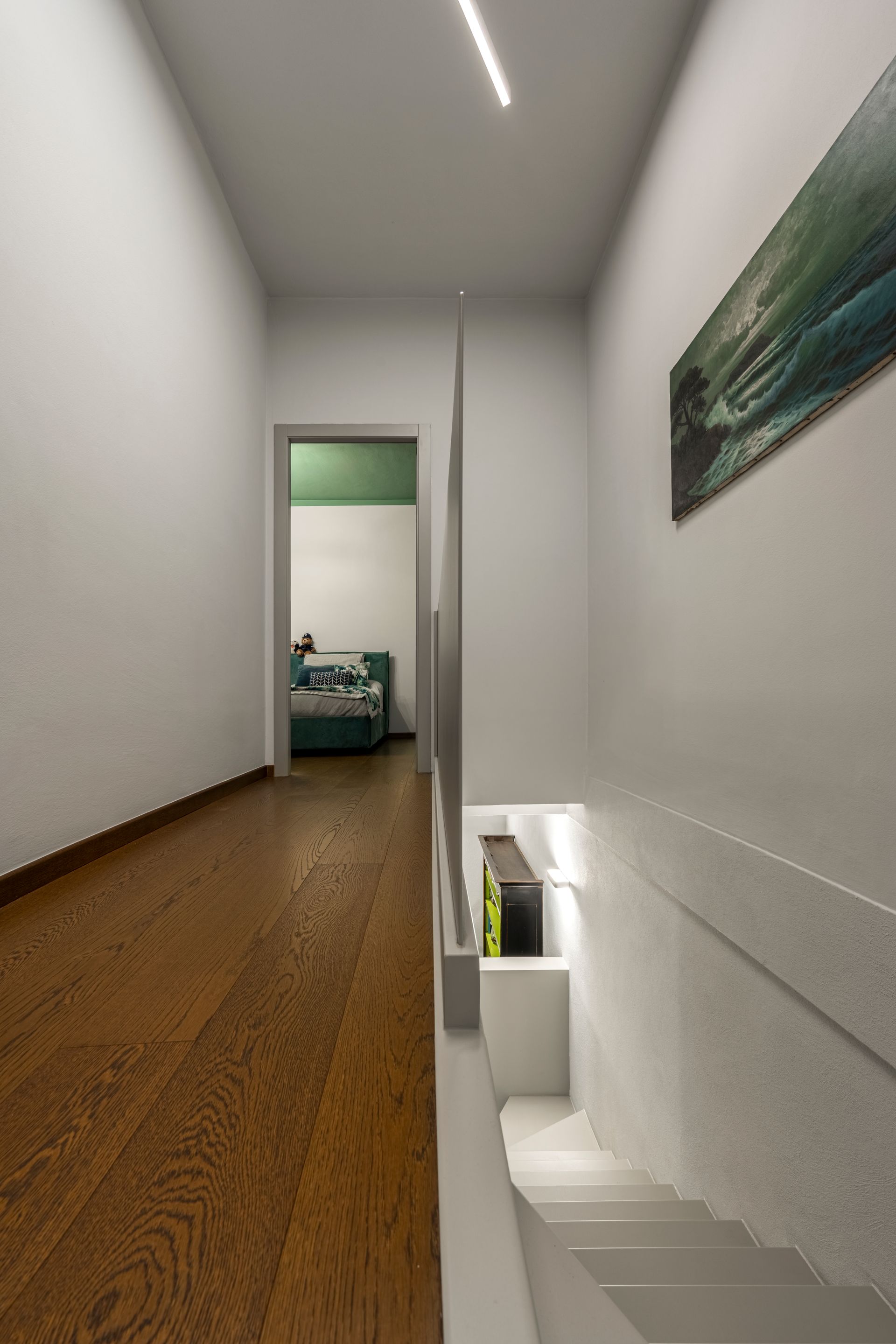 Si accede al primo piano attraverso una scala rivestita in legno oliato nero, dove i gradini vengono esaltati da un profilo led.