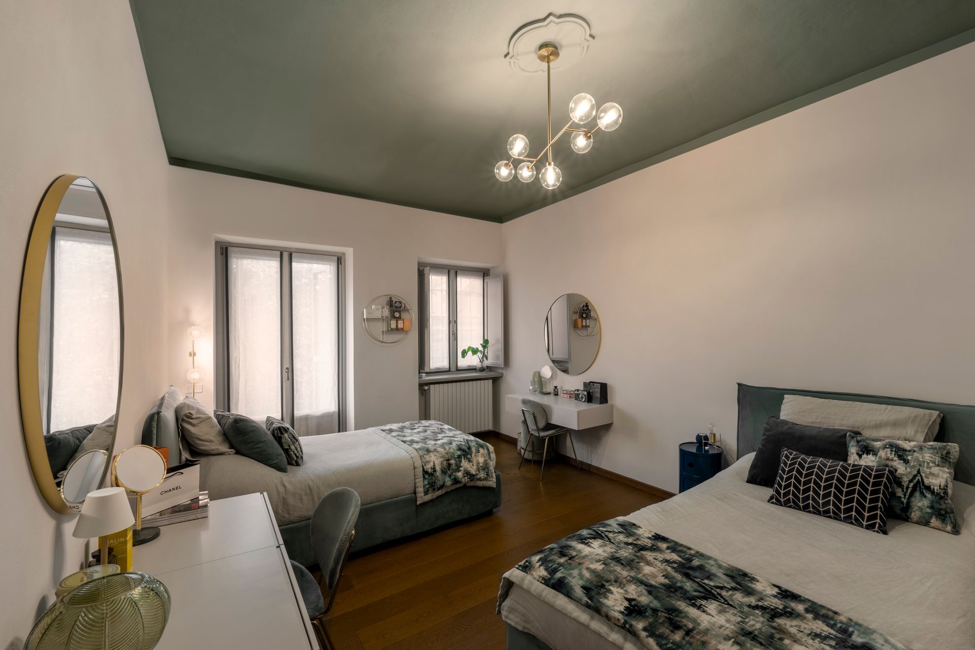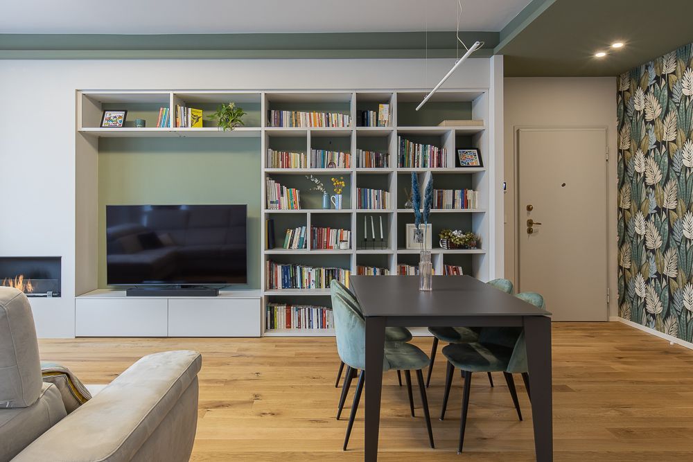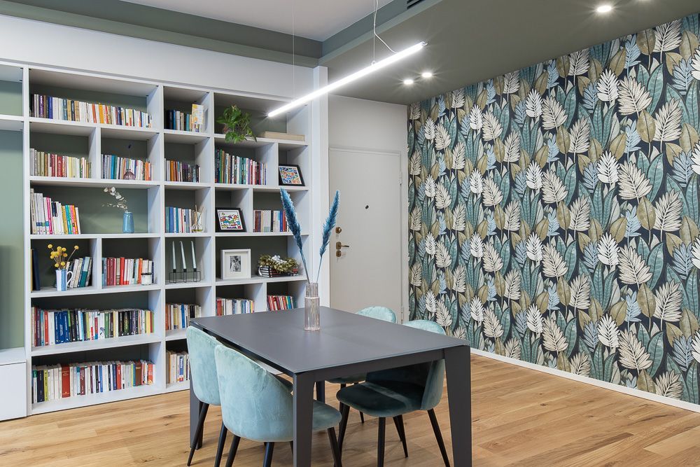 dei verdi. Questa scelta stilistica ha permesso di dare una forte personalità alla zona giorno catturando da subito l’occhio di chi entra. L’ingresso è stato poi valorizzato da un controsoffitto colorato e da una illuminazione con coppie di faretti. La camera da letto, di dimensioni generose ha permesso di realizzare una cabina armadio passante.