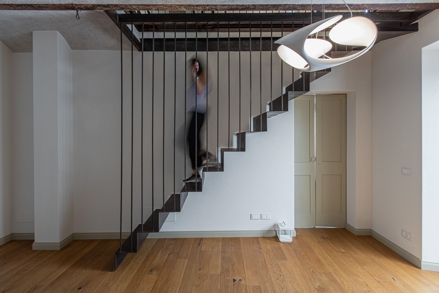 Il focus del progetto ruota attorno alla scala, l'elemento che più aveva necessità di essere modificato dal punto di vista dei materiali. Del corpo scala é stata mantenuta la stessa struttura, ma sono state rivestite le pedate in legno insieme alla pavimentazione. Si tratta di un rovere caratterizzato da plance decisamente larghe.
