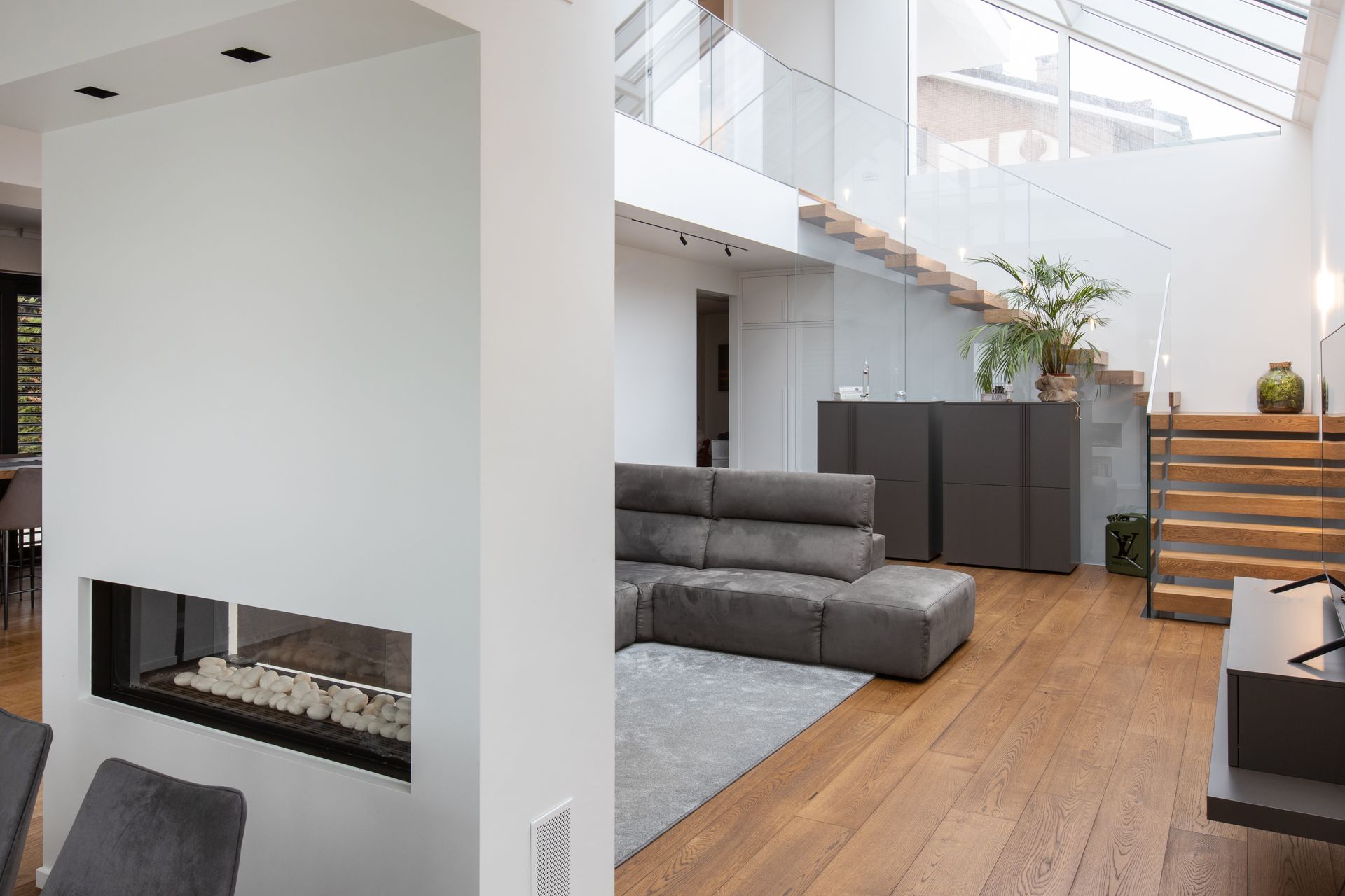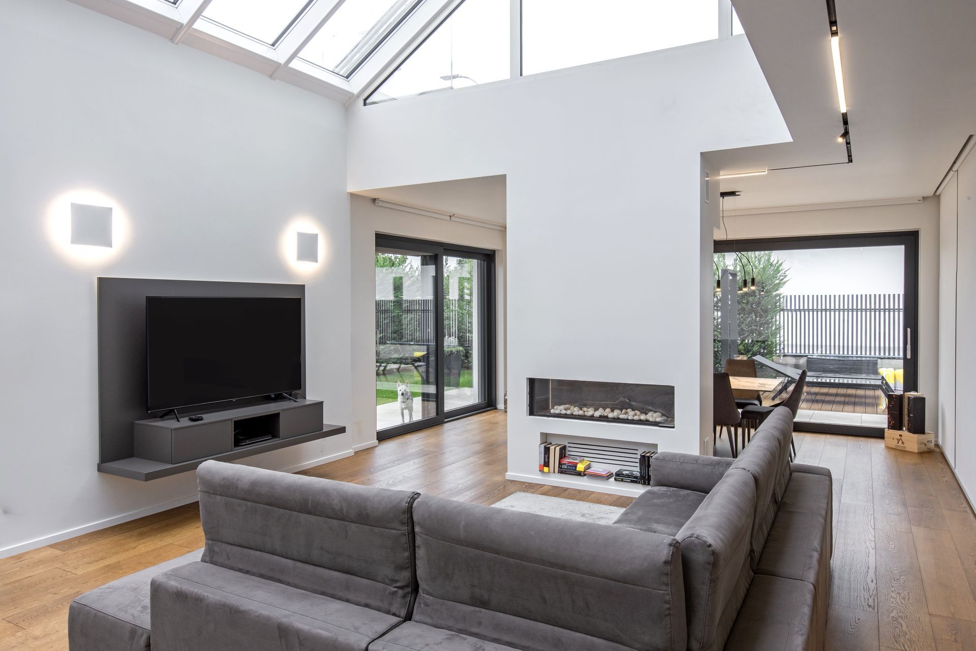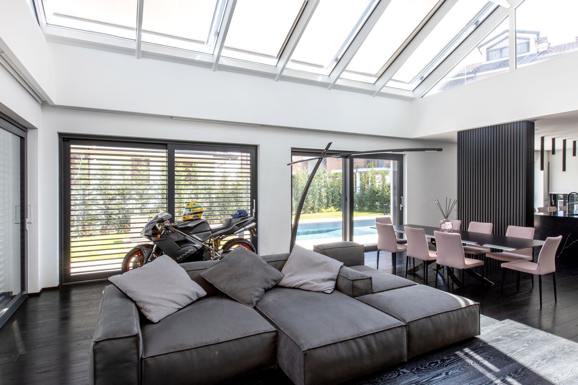 La zona giorno è un grande open space diviso solamente da un camino bifacciale che nasconde un'intima zona pranzo. Protagonisti di questa villa sono i materiali delicati e lo stile minimalista e ricercato. Il bianco dei muri è una tela bianca su cui risaltano tutte le geometrie,gli elementi d'arredo su misura, il legno, le superfici vetrate e l' illuiminazione. Un gioco sapiente di luci e ombre enfatizza ogni dettaglio.