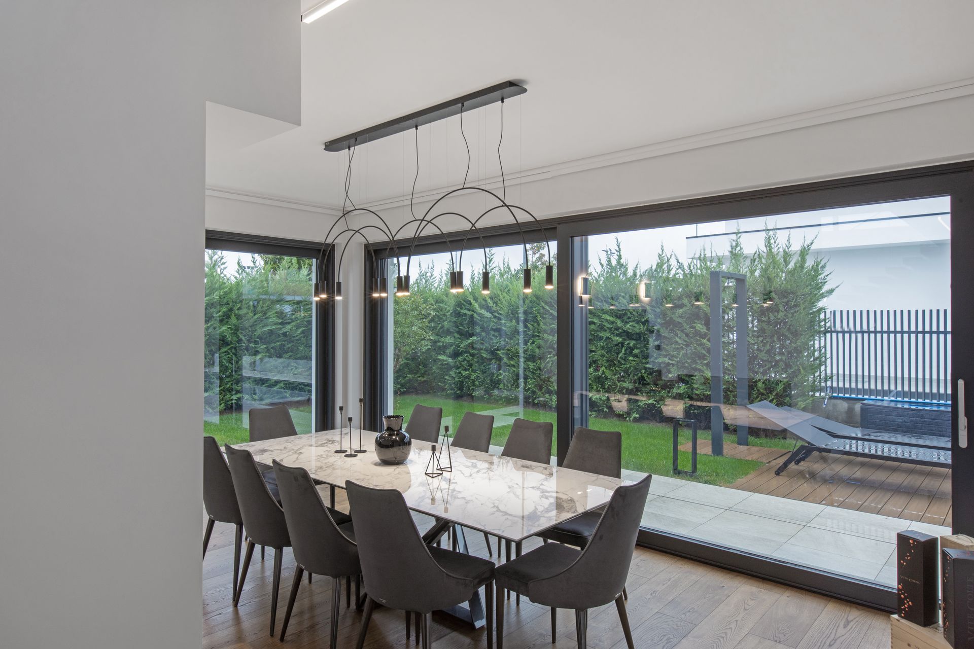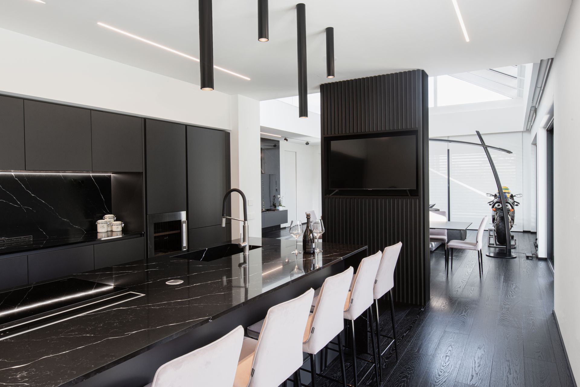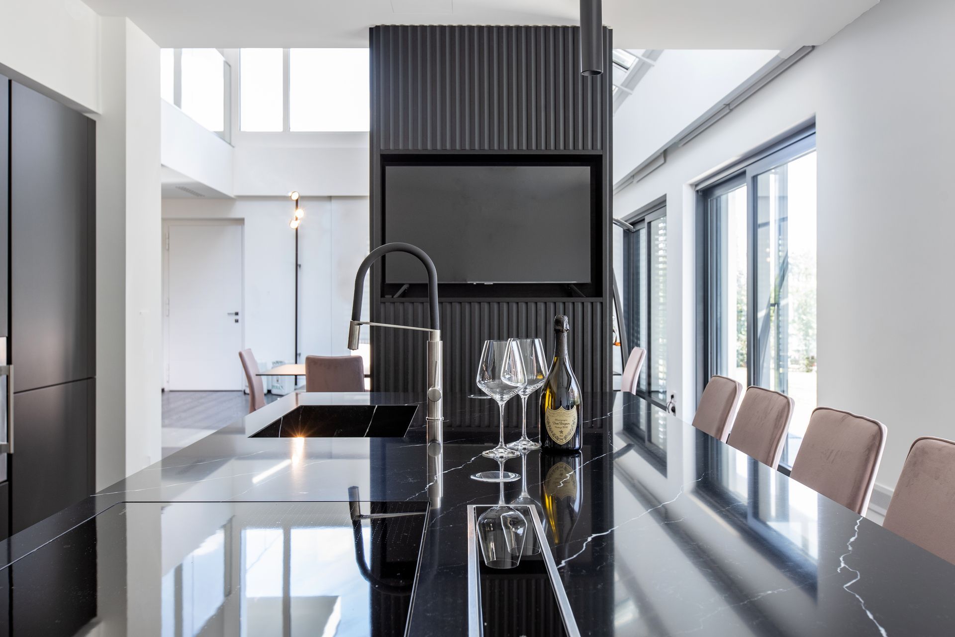 La zona giorno è un grande open space diviso solamente da un camino bifacciale che nasconde un'intima zona pranzo. Protagonisti di questa villa sono i materiali delicati e lo stile minimalista e ricercato. Il bianco dei muri è una tela bianca su cui risaltano tutte le geometrie,gli elementi d'arredo su misura, il legno, le superfici vetrate e l' illuiminazione. Un gioco sapiente di luci e ombre enfatizza ogni dettaglio.
