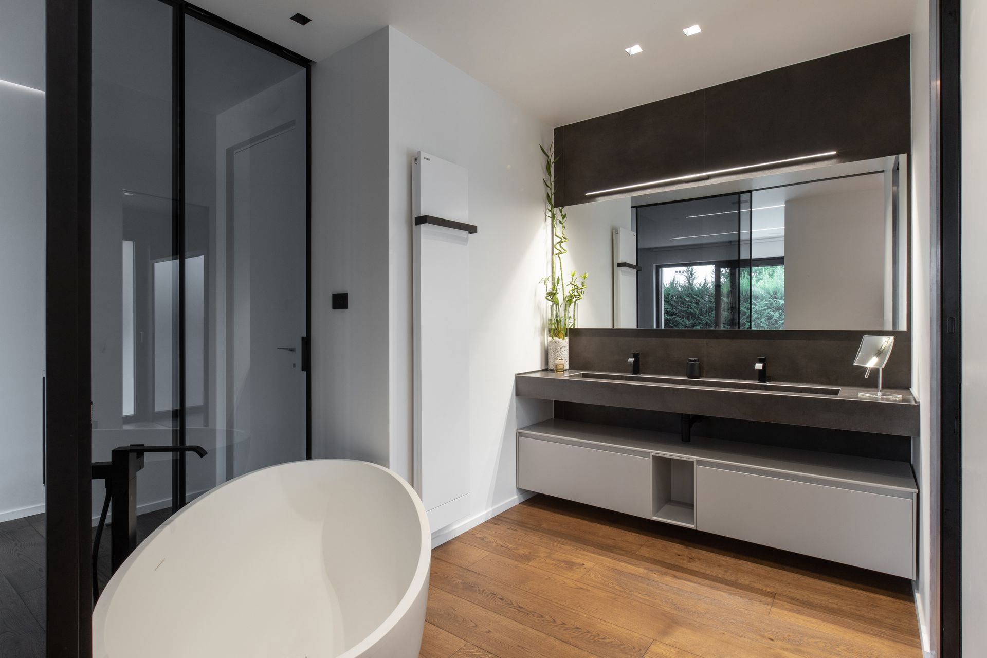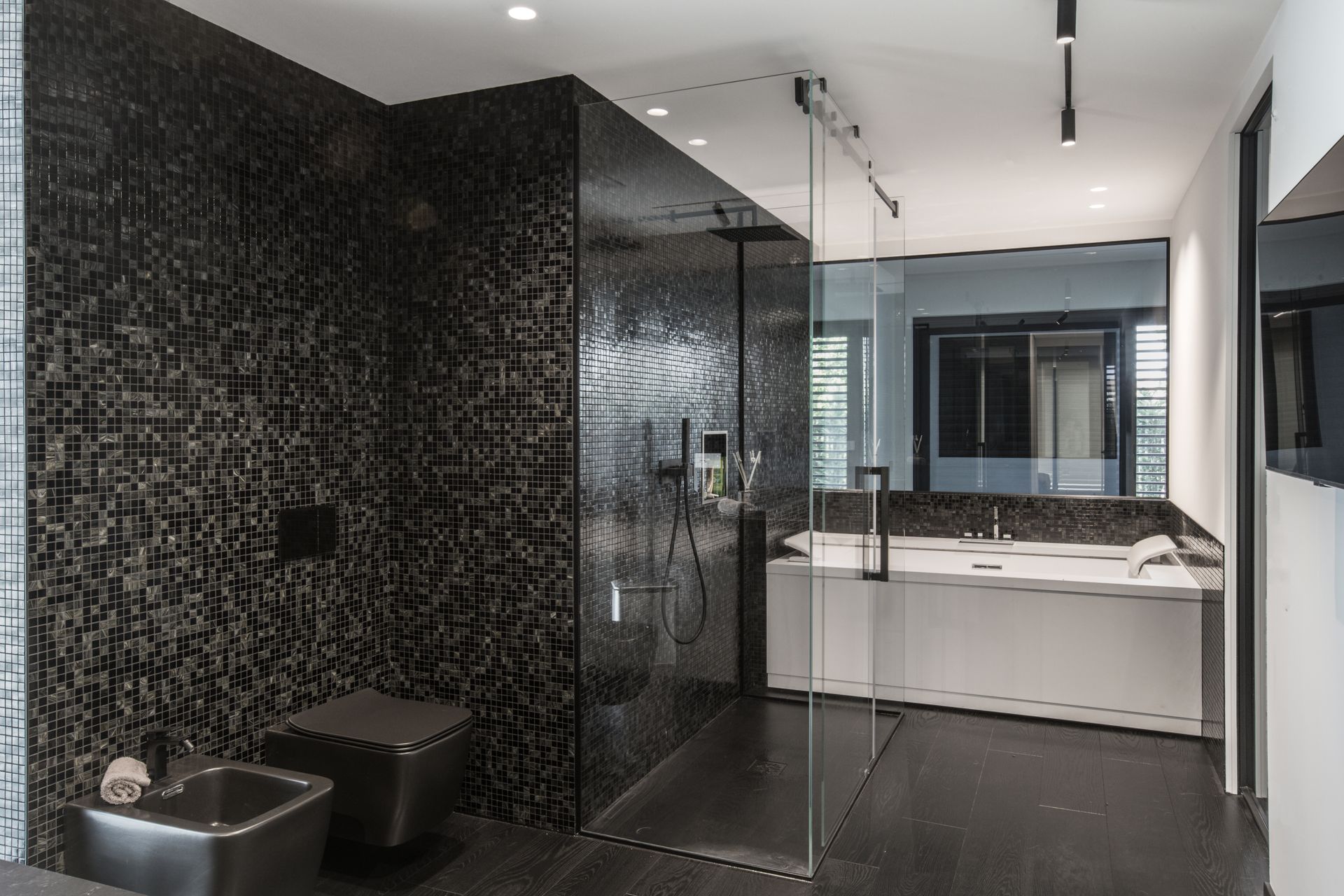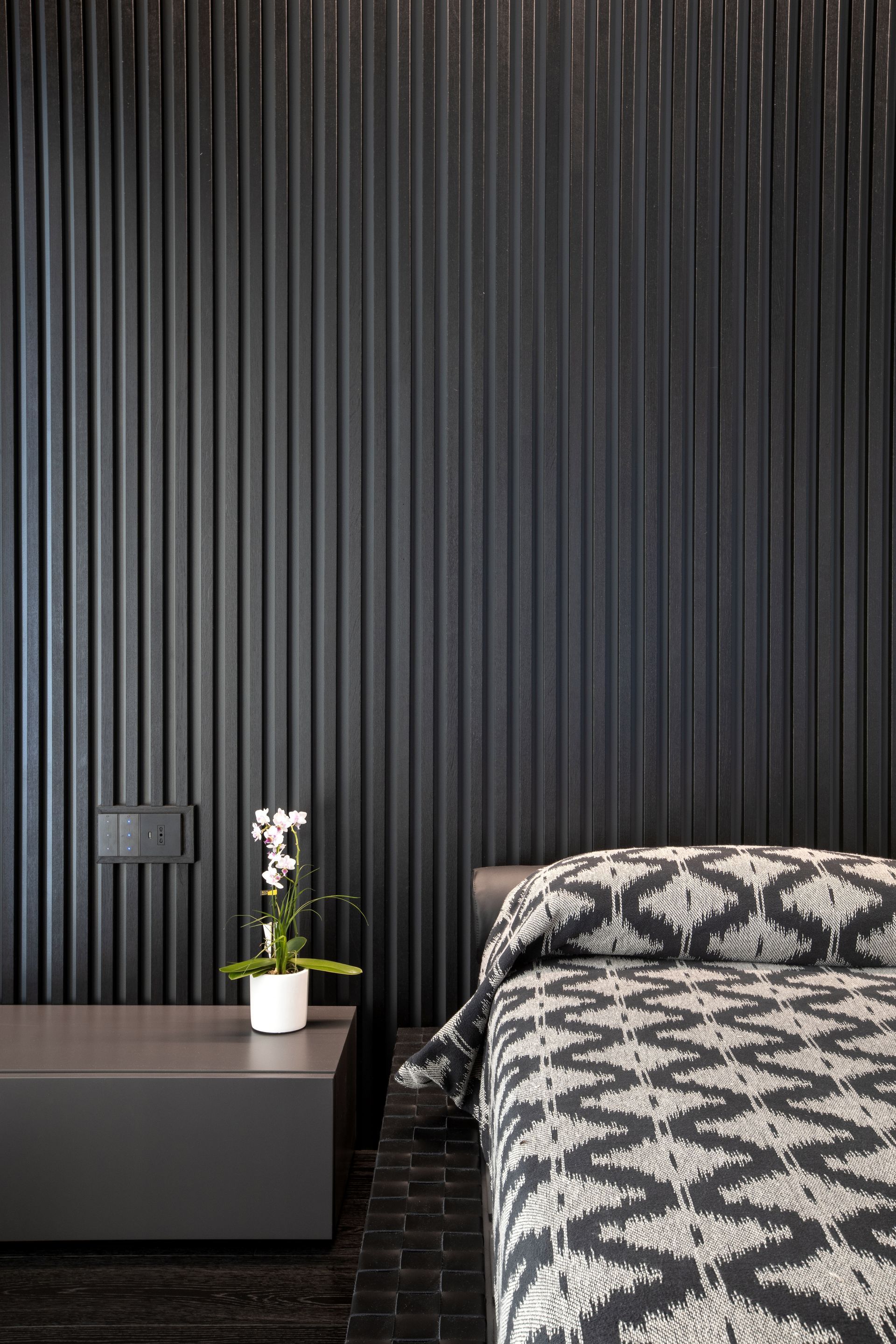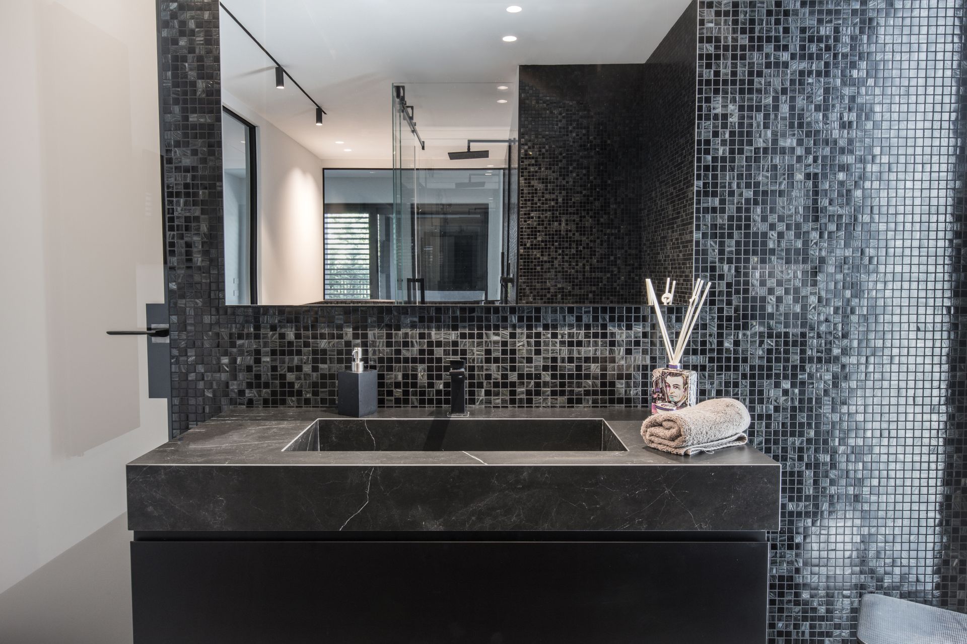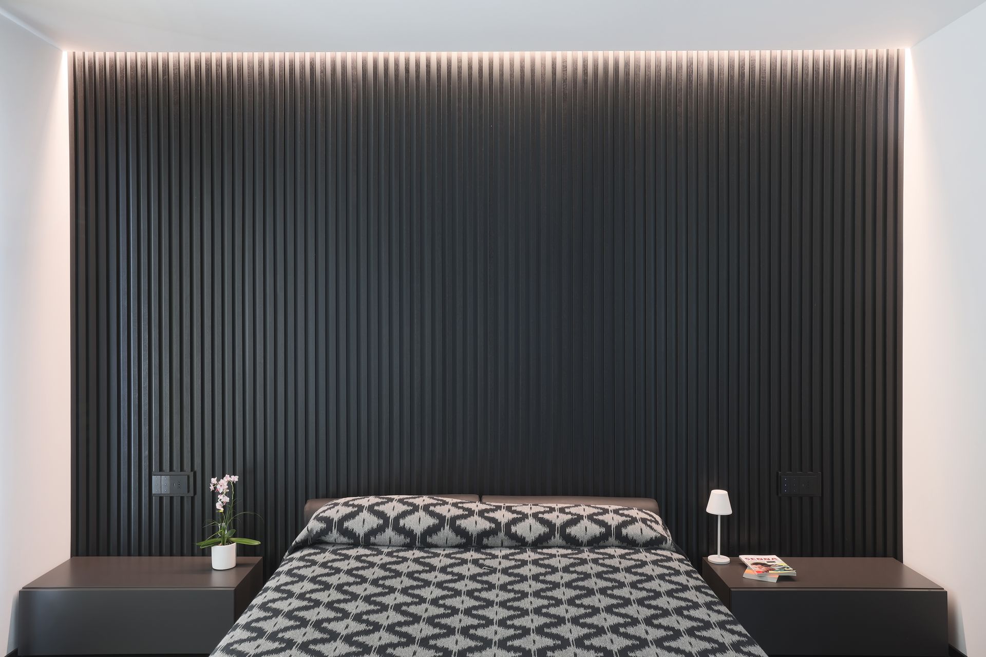 La boiserie che riveste la parete dietro al letto, impreziosita da un effetto wallwasher led, riprende la parete bifacciale della zona giorno. Il bagno padronale è stato pensato “black and white”, le tessere di mosaico, pur essendo nere, risultano brillanti e vivaci.