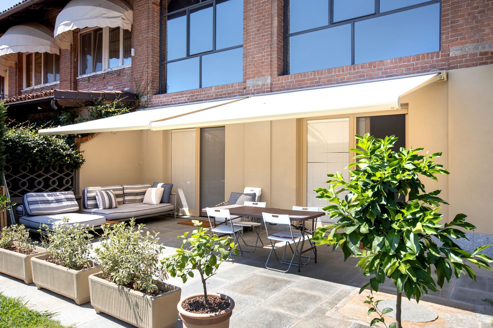 Dal punto di vista della riqualificazione energetica, le facciate esterne sono state rivestite con un cappotto termico in EPS con grafite e rifinite in parte a intonaco e in parte con pannelli modulari in legno composito; quest’ultimo materiale è stato utilizzato anche in doghe per pavimentare la zona solarium a lato della nuova piscina e parte del camminamento pedonale. I nuovi infissi esterni, con apertura a battente e ad alzante scorrevole per quelli più grandi, sono in PVC con rivestimento esterno in alluminio e le schermature solari a lamelle orientabili permettono di modulare la luce fino all’oscuramento totale. L’energia elettrica viene autoprodotta da un impianto fotovoltaico; per la climatizzazione e la produzione di acqua calda sanitaria è stato installato un sistema ibrido (pompa di calore + caldaia a condensazione) collegato a un impianto radiante a pavimento per la climatizzazione invernale, mentre il raffrescamento estivo è affidato a un sistema canalizzato nascosto nei controsoffitti.